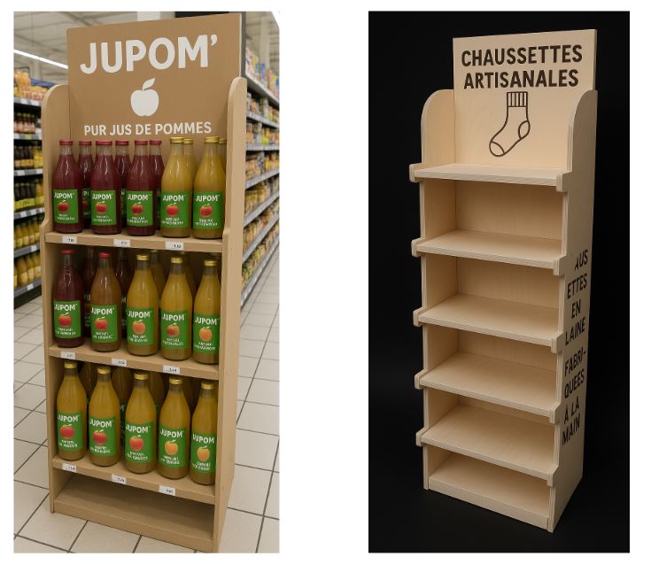 Présentoir étagère pour toute marchandise. Écologique, économique, personnalisable, réutilisable, montage/démontage sans outils, avec ou sans décor.